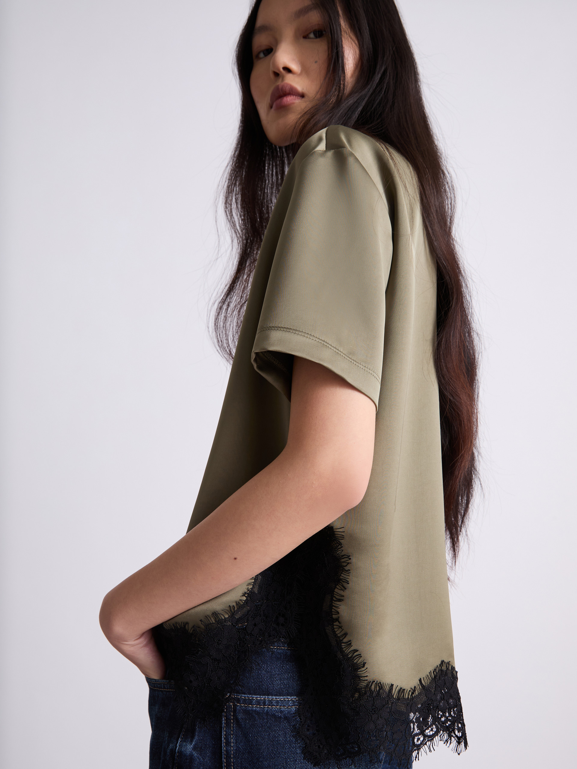 T-shirt in raso con pizzo - KAKI